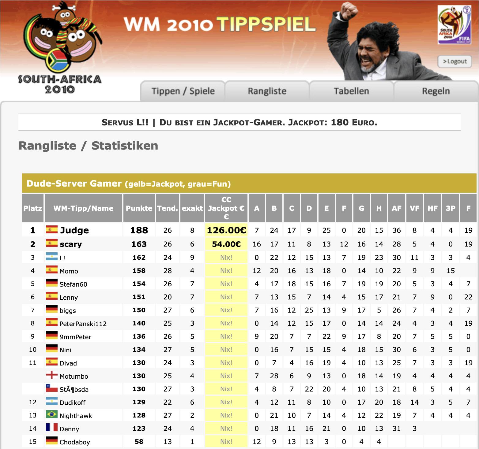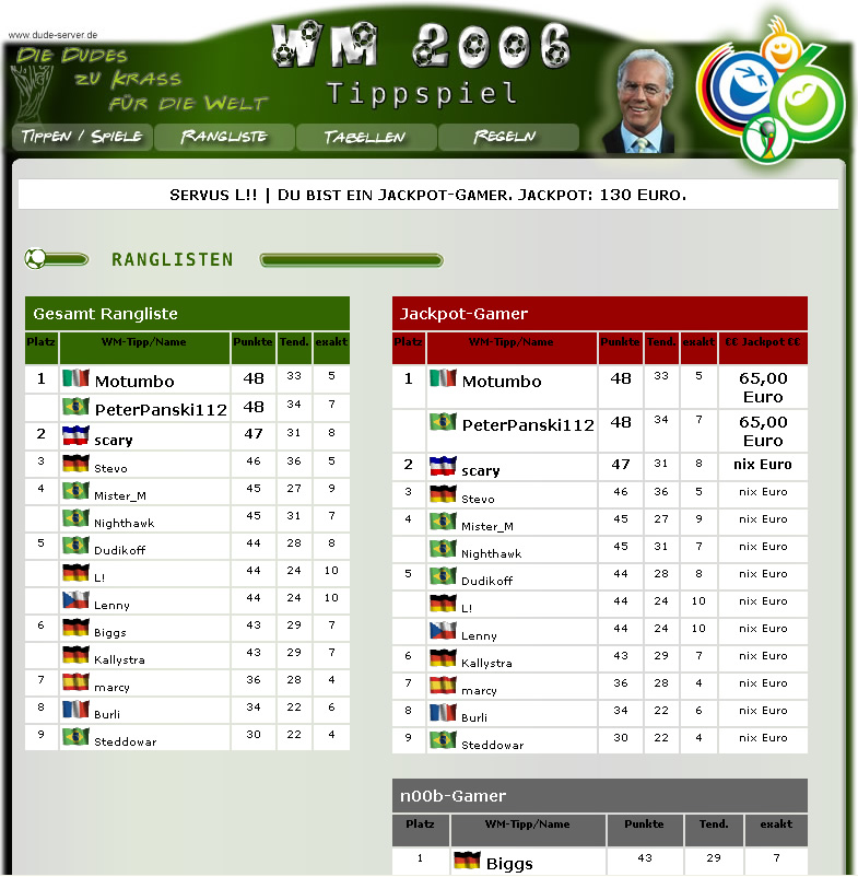 Das Dude-Server Tippspiel gibt es seit sage und schreibe 2004! Vermutlich war das der erst Online-Tippspiel der Welt. Hier könnt ihr sehen, wie wir früher so abgeschnitten haben..